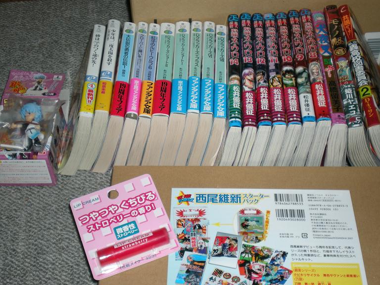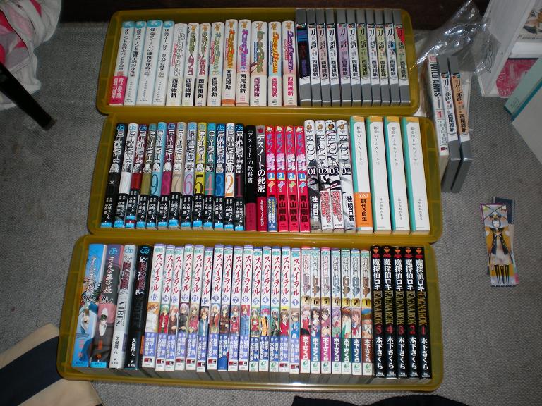 砂はマのつく途の先! 少年は二度太陽を殺す2 クローバーに願いを 紅牙のルビーウルフ6 DクラッカーズⅥ・Ⅶ ショートⅠ・Ⅱ プラス 脳噛ネウロ8~14 犬夜叉52 モノノ怪 壱 轟高校図書委員会2 西尾維新スターターパック おまけでリップと銀さん。 ゆーりんどうに行って来ました。 そして帰りに寄ってみたダイソーで友人三人+αと会いました……。 続きは、私の本棚事情。自己満足でかいた。 けど友達が家に来たとき、 真っ先に友人共が本棚に群がるくらいには本の量があるよ! ……あれこれ友達? 友達か?orz えー、今日 購入した本を本棚に入れようとして 本棚に入りきらず溢れている本を見て 思わず清掃本能が目覚め 気付けば私は本の整理をしていました……。 以下の写真は本棚整理前。 整理後は……ありませんw(ぇ) ダンボールがなくて入りきらなかったのあったからまだ終わってないし。 というわけで、れっつしゃっしーん。デジカメ万歳。 本棚:左・中・右。 左右は漫画、中央は小説なのです。 左が空いてるのは、中途半端に整理中に撮ったから。 ナルト出してネウロ移して色々出した後にそうだ撮ろうと思ったのでw あと、右に入ってるハガレンの巻数が足りないのは貸してるからです。 本棚下部:左・右 見えませんが下の段は二列になっているので、 犬夜叉の後ろに確かドラゴンボールが入ってます。 右の後ろは……BJとかうるせいやつらとかめぞんとか、 まあ後ろは基本古いの入ってる。 左上の段はHxHと図書館戦争・うえき+・ スパイラルアライブ・下に入りきらなかった犬夜叉らへん。 左上は……ファイルですねえ。 ええと、ファイルとジャンプのリボ・Dグレ・銀魂・勇者学あたりかな? 袋に入ってるのは貸したときのまんまだからかなぁ……。 ファイルは邪魔だから入れてある(ぁ 本棚横の棚下:ガンガン入れ。 もぎ取ったガンガンを入れるスペース。 けどガンガンを買わなくなったので、放置状態。 鋼・螺旋・ネルガルさん中心に集めてました。 ああ、あと……なんだっけ、紅王子?っていうのも微妙にあった。 本棚横の棚中央:攻略本。 ゲーマーなので。 本棚横の棚上飛ばして屋上:でかいの。 サイズ合わないでかい本。 千と千尋の絵本が入ってますね。 ……ええ好きですがなにか! 本棚横の棚番外:WA攻略本。 本棚横の棚の前(ガンガン入れの前)に置いてあるダンボール。 実は撮り忘れた本もあって、後2、3冊はある。 WAはどんなクソゲーになろうとファンで居続けようと決めたゲーム。 ベッド下:ベッドの下に入ってるダンボール箱。 完結したのとか入れてたらすぐに入らなくなったダンボール。 喪失とか、途中で集めるのをやめた野球漫画とか、いろいろ。 本棚前:さっきの悲惨な状況。 さっきまでこんな状態でしたw ナルトをしまいこんだときの。 ダンボール箱のがナルト。これも途中で集めてない。 少年漫画長編の長さは半端じゃねーんだぜ……!! (DB・犬夜叉・こちかめ・コナン系とかね!) おもにDBと犬夜叉とうるせいやつらとらんまで懲りてるの。 あれなんか高橋留美子ばっか。 (……さりげなくP2が終わったときのジャンプ置いてある……) 窓際の三つの本入れ:完結作とか、遅いのとか。 戯言の巻数が足りないのは、友人に貸してるからです。 一番上が西尾とはやみねさん。 真ん中は、トム&ソーヤとBLOOD+とまじ快とデスノらへん。 下は魔ロキと魔ロキと螺旋らへん。 ―■― はい、本は以上です! これでも撮ってない本もあります! 本棚に入りきらず、しかも部屋にも入りきらず、 他の部屋に置いてあるものが……。 あと実は机にも乗ってるのあるし……ぬおおダンボールほしい……。 あざのの本はBBBもDクラも完結なので、 抜き取ってダンボールに入れようかと思います。 ……ショートストーリーはまた出そうで怖いけど……。 てか……見つからない本あるよ…… とど高一巻とか……色々と見つからないのあるよ……あれっ…… 本棚横の棚屋上:屋上の本の重さにさえ耐えられなかった棚。 数の少ない屋上ですらコレです! ちなみに真ん中は既に逝ったあとです^^ (真ん中は、隠して撮っていますが 白くなっているところがあって、それ実は接着剤です^^) 微妙に見えているのはどっと吐く//自由 三部作です^^ 本日の失態:クローバーに願いをとショートストーリーⅠかぶった。 HAHAHA☆ やっちまったぜ……。 被ったよ。はっはっは! しかもスターター買ったから戯言一巻と刀語一巻も被ってるね! ……そういえばルビーウルフ、6巻だけ色違う……。 PR